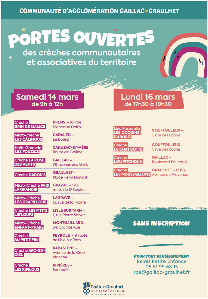 Portes ouvertes des crèches 14 et 16 mars 2026 Posted on 17 February 2026 Participez aux portes ouvertes des crèches communautaires et associatives du territoire le samedi 14 mars et le lundi 16 mars 2026